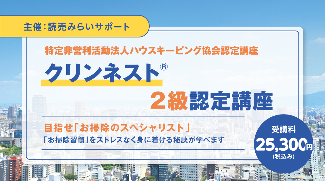 その読売みらいサポートが主催し、「クリンネスト®2級認定講座」を読売新聞大阪本社で開催します。